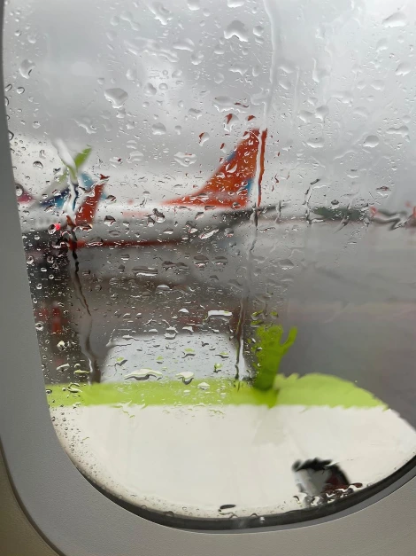 비행기에 탑승했다. 이렇게 비가 쏟아지는데 과연 비행기가 뜰 수 있는걸까. 걱정이 좀 되어 창 밖을 찍어봤다. (사진으로는 표현이 잘 안된다. 나는 사진은 안되나보다.)