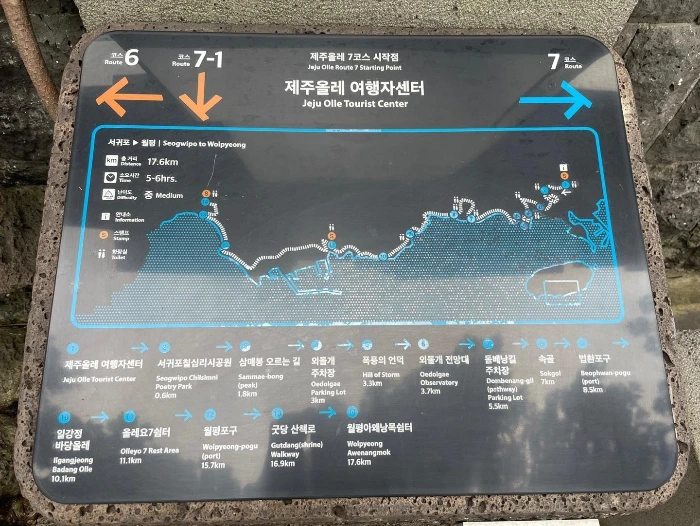 코스 시작점에 아래와 같은 안내판이 있다. 어제는 좌측 6코스 쪽으로 출발했고, 오늘은 오른쪽 7코스 쪽으로 출발이다. 오늘은 파란 리본과 안내표식을 따라가면 된다. (역방향은 주황색)