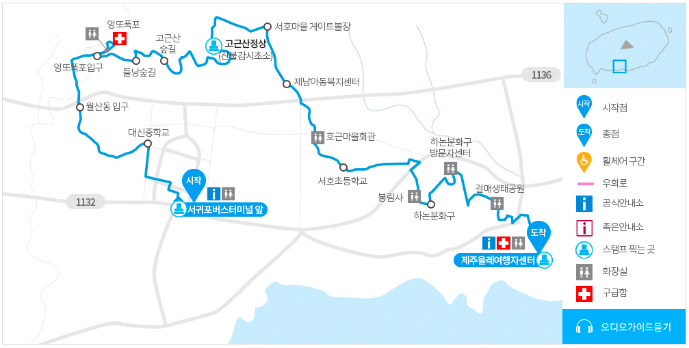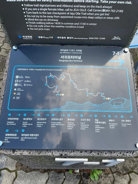 7-1코스의 끝지점(제주올레여행자센터)에서 시작지점(서귀포버스터미널 앞)까지 15.7km를 거꾸로 걷는다. 주황색 리본을 따라가면 된다.