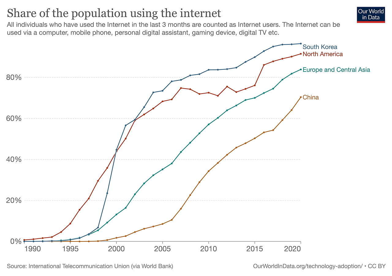 4.9 billion people use the internet around the world. That’s 62% of the global population. However, not every country is created equal. In the United States, there are 307.34M internet users (93% of the population). While China has a much larger number (765M), that’s only 54.3% of the country’s entire population. - Zippia, published 2022.03