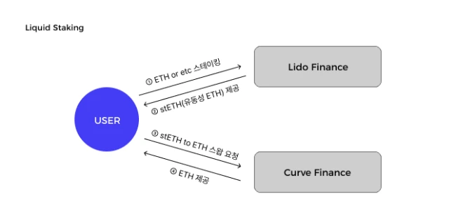 이러한 문제점을 해결하기 위해 우리는 현재 시장 거래량이 가장 큰 이더리움 생태계를 레퍼런싱 할 필요가 있겠습니다. 이곳에는 Lido라는 제품이 있습니다. 유저가 이를 통해 스테이킹을 하면 해당 거래에 대한 영수증 격으로, 유저가 제공한 토큰 수량만큼 동일한 stToken을 유저 지갑으로 전송합니다. 또한 유저는 이 stToken을 가지고 Curve로 갑니다. 원래 토큰과 동일한 수량 비율로 생성되어 있는 풀에서 바로 스왑을 하면, 유저는 원래 토큰을 스테이킹 한 상태에서도 동일한 수량의 내 자산을 유동적으로 사용할 수 있게 되는 것입니다. 이것을 스테이킹의 유동화, “Liquid Staking”의 동작 원리입니다.
