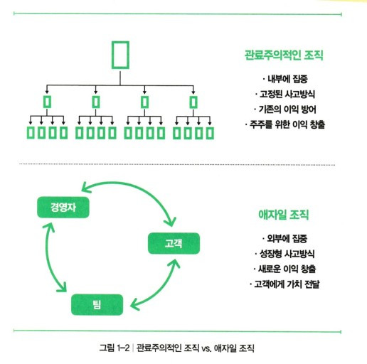 관료주의 조직과 애자일 조직은 어떻게 다른가? 관료주의 조직은 하향식이고, 내부에 집중하고, 상호작용이 빈약하다. 고정된 사고방식에 갇혀 있고, 기존 이익을 방어하고, 주주이익 창출에 몰두한다. 반면, 애자일 조직은 자율적이고, 외부(고객)에 집중하고, 상호작용이 풍부하다. 성장형 사고방식을 하고, 새로운 이익을 창출하고, 고객가치의 창출과 전달에 몰두한다(스티븐 데닝(2019) 참조).