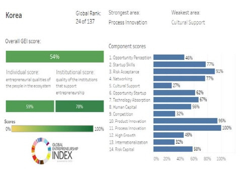 준비된 창업이 중요하고 기업가정신이 중요하지만, 우리의 사정은 그리 좋은 편이 아니다. 세계기업가정신발전기구(GEDI)에 따르면, 2018년 우리의 기업가정신 지수는 54.2점(24위)으로 OECD 평균(59점)보다 4.8점이나 낮았으며, 호주(5위), 홍콩(13위), 대만(18위) 등 주요 아시아·태평양 국가보다 한참 아래에 있었다. 기업가에 대한 '직업적 선호도'가 특히 낮았는데, 주요 52개국 중 49위에 그쳤다. 기업의 국제화 수준 지수도 OECD 평균(0.68)의 절반에도 못 미치는 0.32를 기록했다. 암웨이에서 발표하는 글로벌 기업가정신 보고서(AGER)에 의하면, 한국은 2016년 23위에서 2018년 33위로 하락했다. 창업을 가정했을 때 "가족이나 친구가 적극적으로 지원해줄 것"이라고 응답한 비율은 54%에 그쳤다. 글로벌과 아시아 평균이 각각 70%임을 고려하면 매우 낮은 수치다.