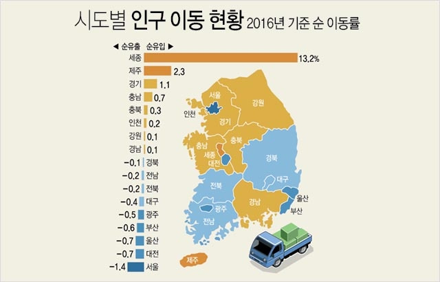 실제로 한동안 세종시의 인구 순유입은 전국 17개 시·도 중 계속 1위였습니다. 수도권으로부터의 유입도 있었지만, 인근 충청권 도시들에서의 유입 인구가 아주 많았죠.