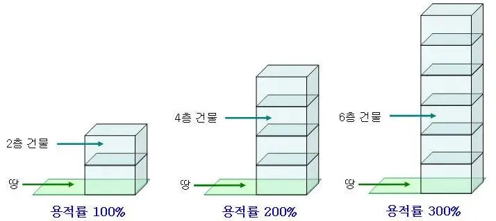 용적률은 땅 크기 대비 건물 전체 연면적 비율입니다. 100평짜리 땅에, 층당 50평짜리 2층 건물을 올렸다면 용적률은 100%가 됩니다.