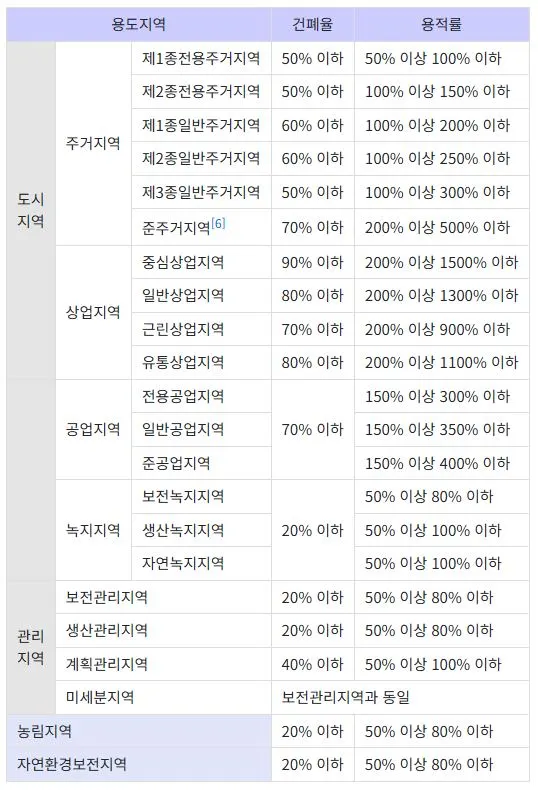 우리나라에서 용적률은 법률에 따라 용도지역별 범위가 정해져있고, 그 범위 안에서 지자체가 상한선을 정하는 구조입니다.