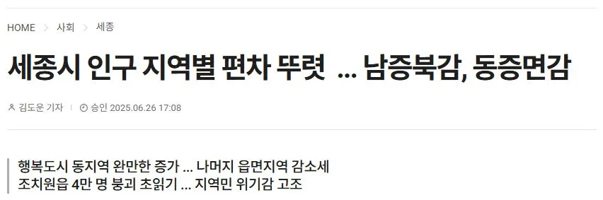 현실은 그에 전혀 미치지 못하고 있습니다. 2025년 5월 기준, 세종시 인구 392,223명 중 읍·면 지역 인구는 82,395명에 불과합니다.