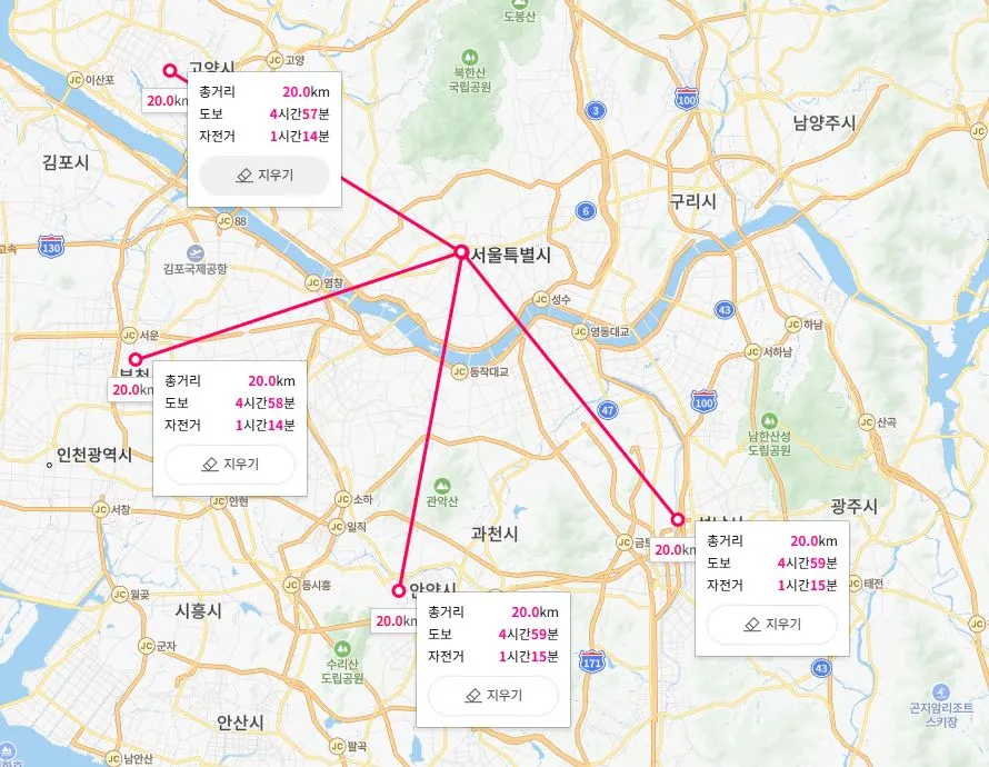 실제로 항공거리를 측정해보면 대략 20km 정도 떨어진 것으로 나옵니다.