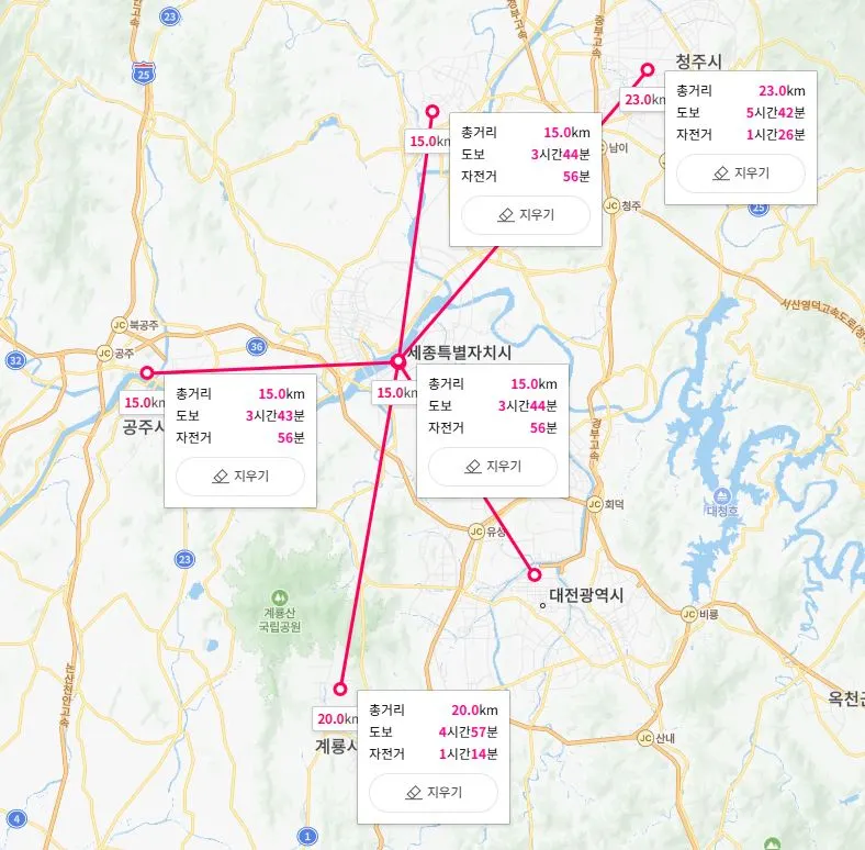 20km 거리에는 계룡시가 있고요, 23km 거리에는 청주시가 있습니다.
