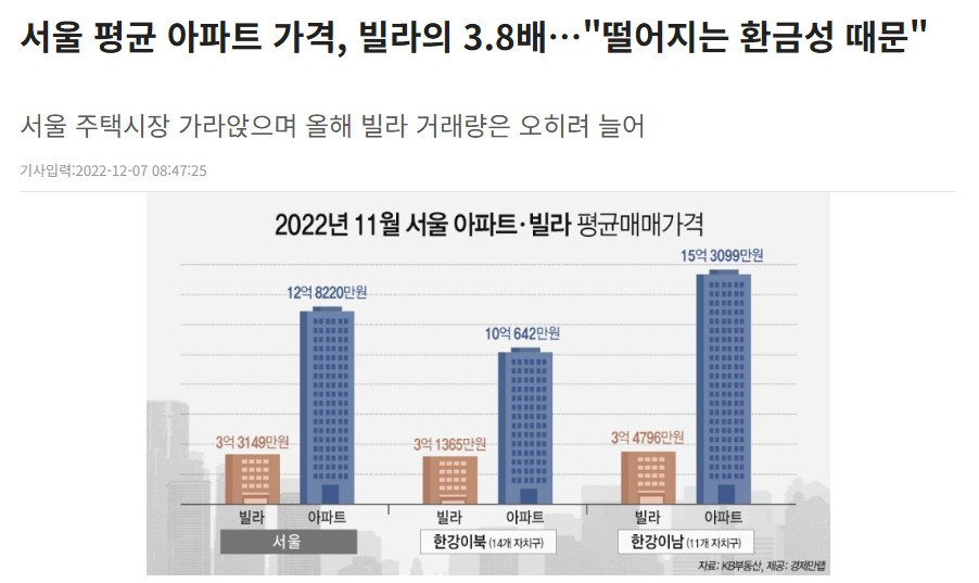 ▲ 사실 모든 부동산은 유동성이 낮다. 그렇지만 그 중에서도 빌라는 아파트보다 더 낮다. (출처: 한국금융)