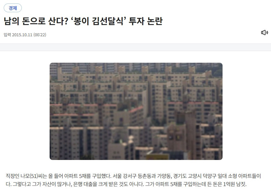 2013년 하반기, 수도권에 새로운 부동산 재테크 기법이 유행합니다. 당초 부산, 대구지역에서 횡행하던 방법이었는데, 효과가 워낙 좋아서 서울에까지 불이 옮겨 붙었다고 합니다.