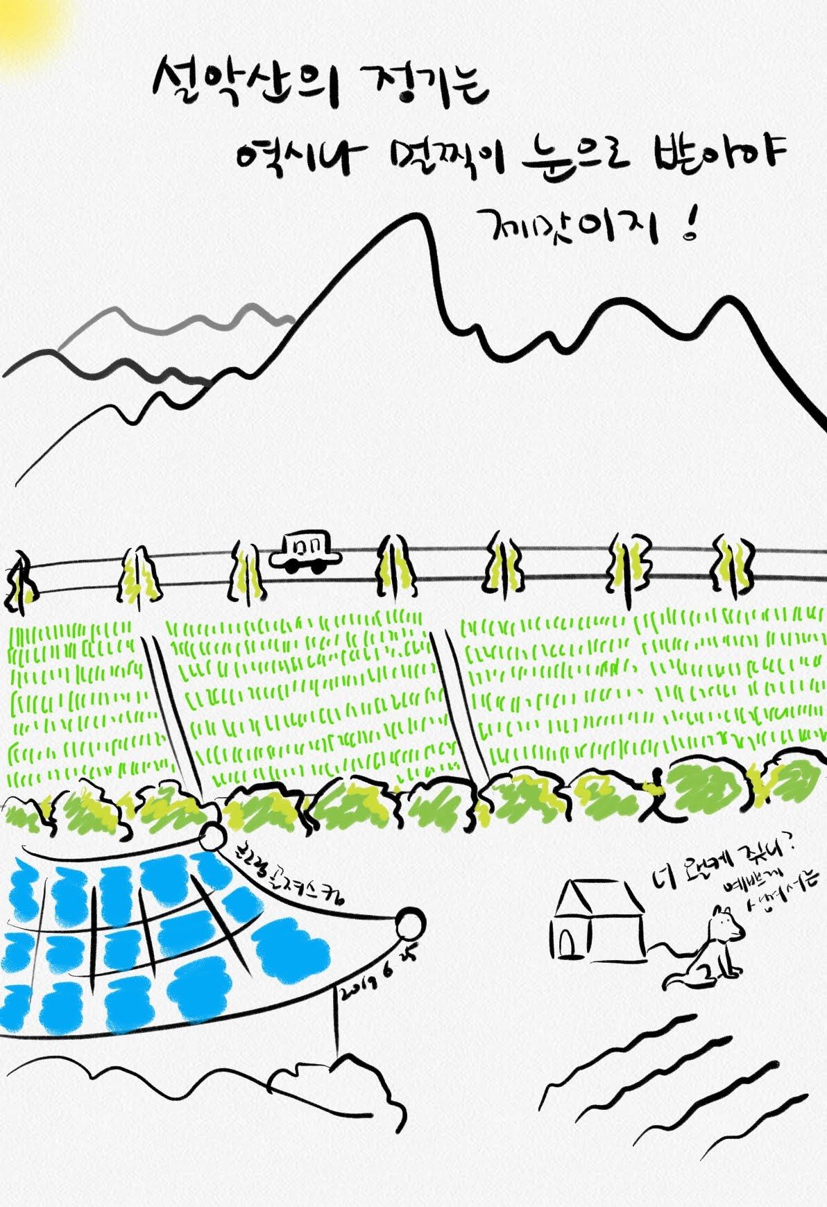 속초에서 받았던 감동을 한 폭에 담아야지! 이 기분을 살려서 한 획에 이어 그려보자! 친절한 숲휴게소 부부와 새침한 길고양이 두 마리. 속초에서 만난 신비로운 우주였어요. 혼자였지만 새로운 우주와 함께여서 심심하게 재미있었습니다.