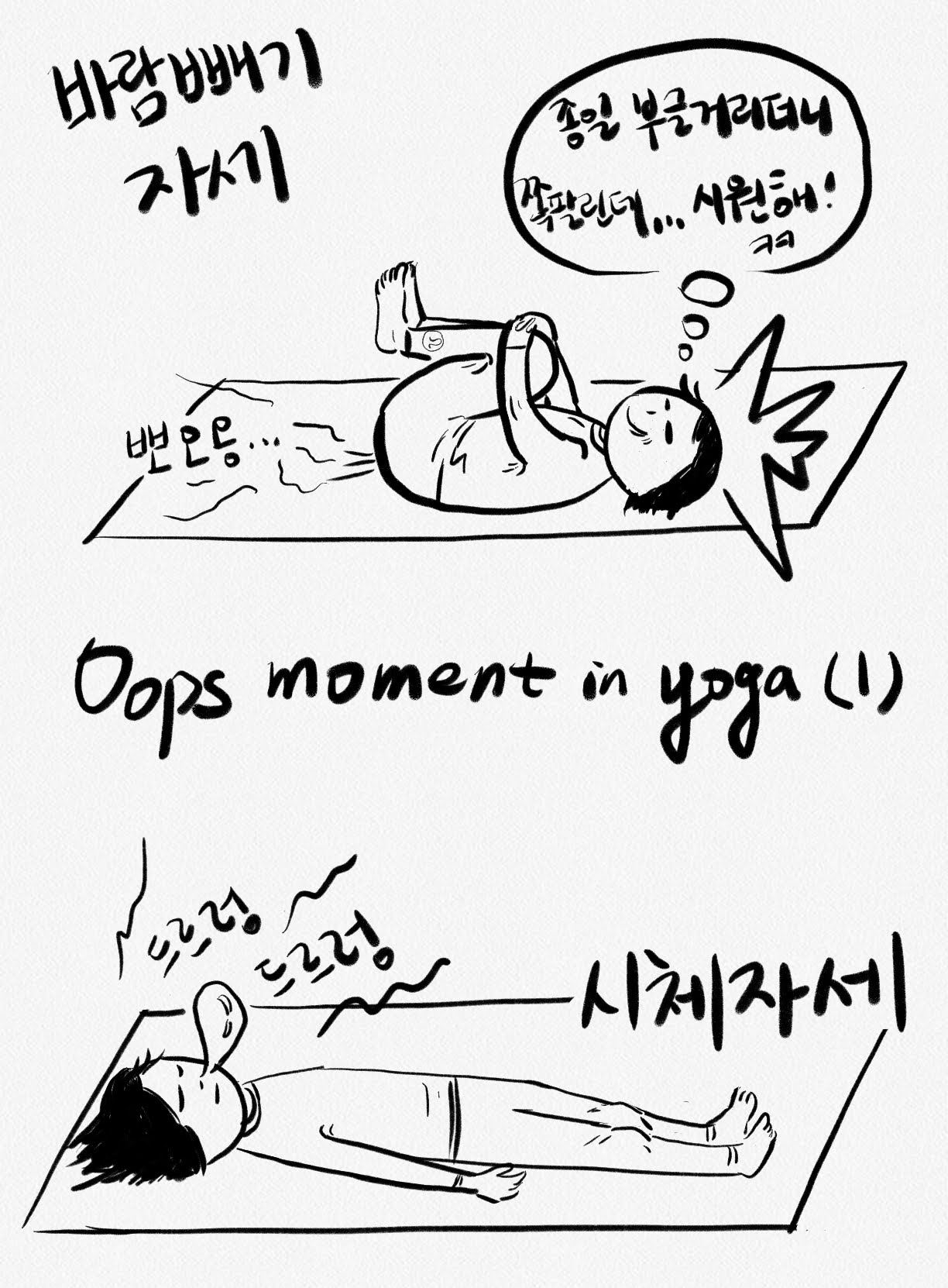 요가를 수련하다 보면 '어머나’하는 순간이 있어요. 하루에 몇 시간을 사무실 걸상에 앉아 있다가 요가 매트 위에서 등을 대고 누워서 굽힌 무릎을 가슴으로 잡아당깁니다. 이 자세를 ‘바람 빼기’ 자세라고 하는데, 이렇게 몸을 움직이면 가스로 가득 찼던 , 뱃속이 정리돼요. 그러다가 몸이 완전히 이완되면 방귀마저 나오게 됩니다. 그런데 요가의 효과는 모두에게 같은가 봅니다. 저뿐만 아니라 주변의 사람들도 방귀를 뀌거든요. 뽀오옹.