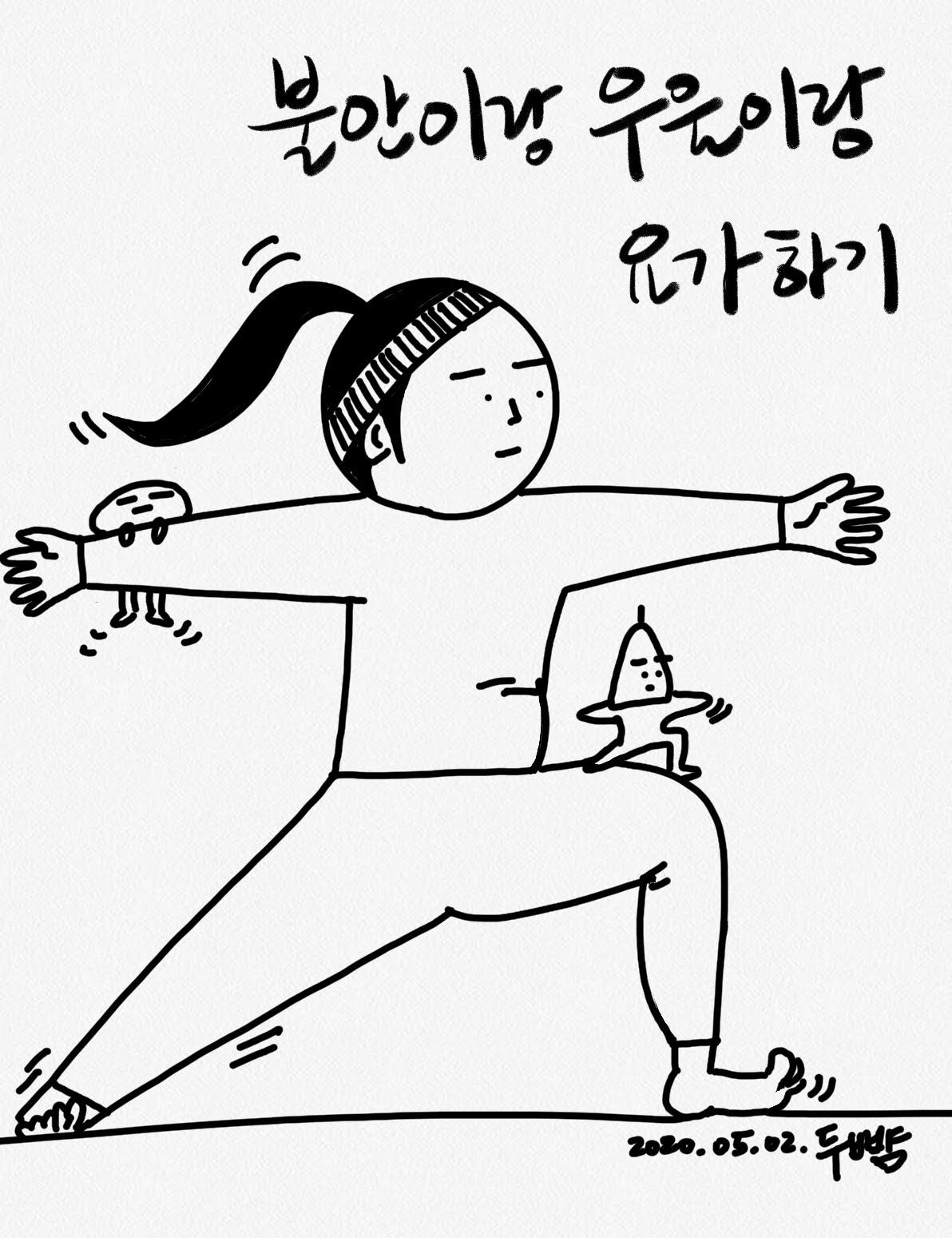 제 친구를 소개합니다. 불안이와 우울이~ 보통은 불안이가 먼저 찾아오고 우울이가 뒤따라 찾아오죠. 코로나로 요가 수업이 2020년 2월 24일 월요일부터 멈췄어요. 그때부터 불안이와 우울이는 무력이와 고민이를 데려왔고요.