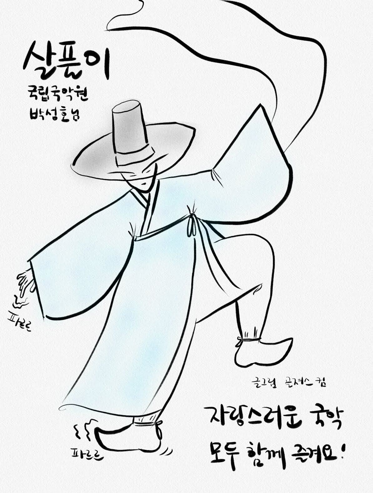 마지막 대미는 살풀이였는데요. 살면서 살풀이는 눈으로 처음 봤어요. 그것도 생생하게... 여자분인가 싶을 정도로 곱고 신비로운 분이 나오는데, 그분이 박성호 님이에요. 그분의 손가락 하나하나가 파르르 떨립니다. 그분의 발짓 하나에도 전율이 느껴집니다. 눈매에서는 감정이 전달됩니다. 긴 명주 수건이 들어지고 맺어지고 풀어지는 모습에 우리네 희로애락이 담겼대요. '나쁜 기운은 없앤다.'는 의미의 살풀이는 그야말로 우리나라 그 자체였어요. 탄성이 절로 나옵니다.