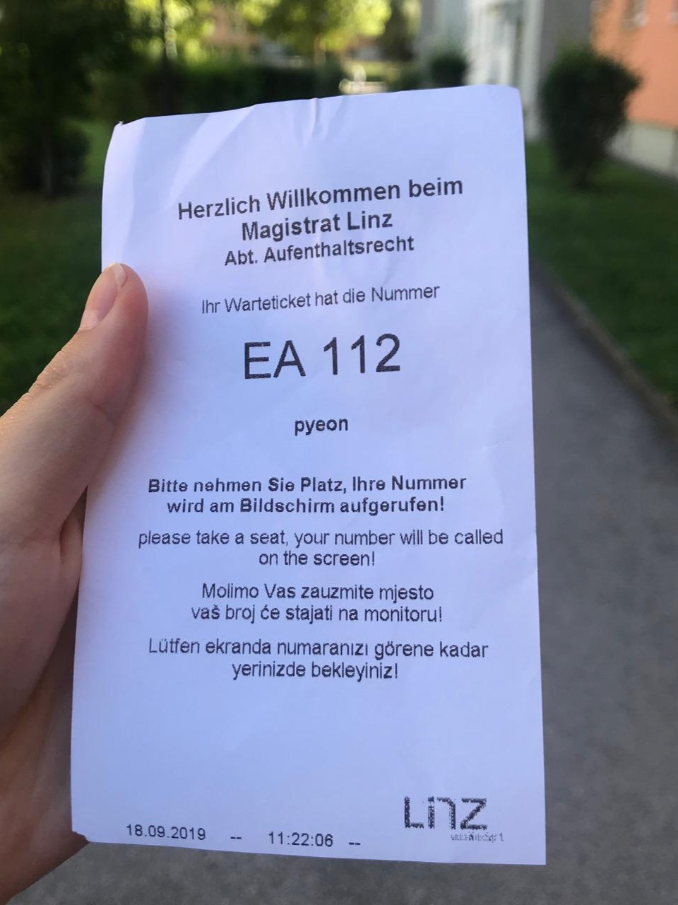미로처럼 생긴 린츠 시청의 입구를 겨우 찾아 푸근한 인상의 할아버지께 말을 걸었다. 목적지를 보여드리자 독일어로 알려주셔서 대충 알아들은 척하고 당케셴을 외쳤는데 친히 나를 담당 부서로 데려다주셨다. 번호표를 뽑고 차례가 되어 들어갔더니 창구 직원분은 여기가 아니라며 직접 창구를 비우면서까지 나를 다른 건물로 데려갔다. 가는 길에 독일어로 영어를 못해서 미안하다고 하다, 나는 유일하게 할 수 있는 독일어 감사하다를 반복했다. 도착한 곳은 다양한 인종으로 채워진 누가 봐도 이주 관련 민원실이었다. 입구에 앉아계신 직원에게 어디로 가야 되냐 물으니 독일어로 화를 내시고 끝에 아!(독일어로 A!) 한 글자 알아들어서 A창구에 가서 줄을 섰다. 들어가서 드디어 영어가 통하는 직원이랑 대화한 결과, 나는 오늘 지문 인증으로 입국을 증명하고 일주일 뒤에 허가증을 찾으러 A창구에 와야 하는 처지임을 알아냈다.