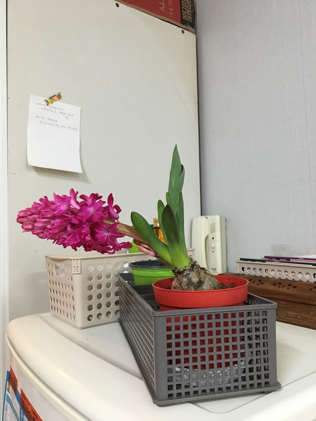 그나저나 히야신스 꽃이 자라는 방향이 아주 난감하다. 계속 저러면 어느 날 갑자기 푸욱 하고 쓰러질 것 같은데 다시 심어줘야 하나?
