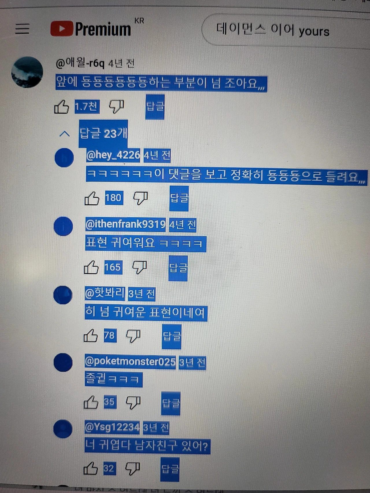 "자기 유툽 댓글 봐바~"