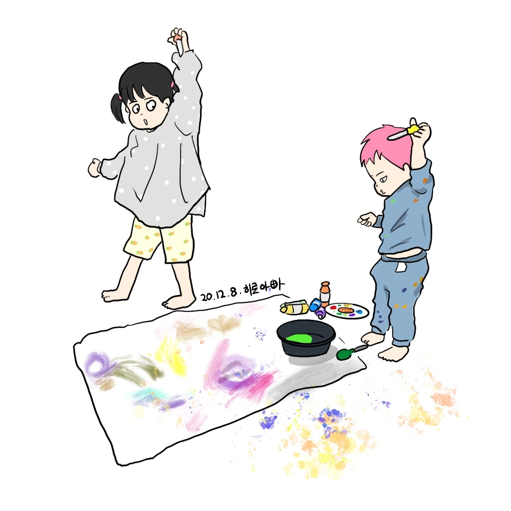 숨어 있던 김장 매트(=방수 놀이매트)가 다시 거실로 등장했고, 수납장에 숨어있던 물감과 미술도구들이 하나둘 아이들의 손에 쥐어졌다.