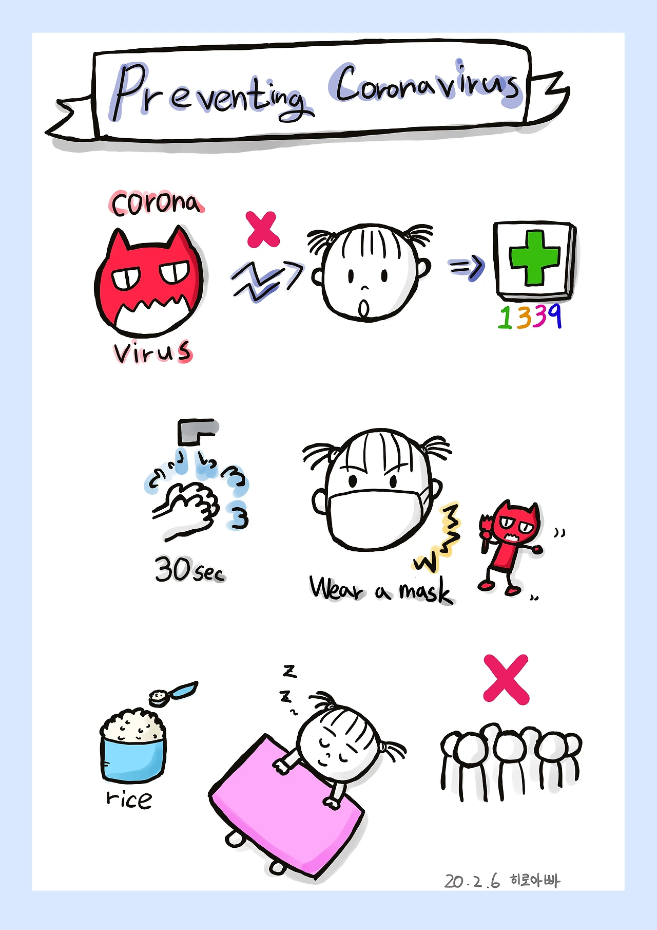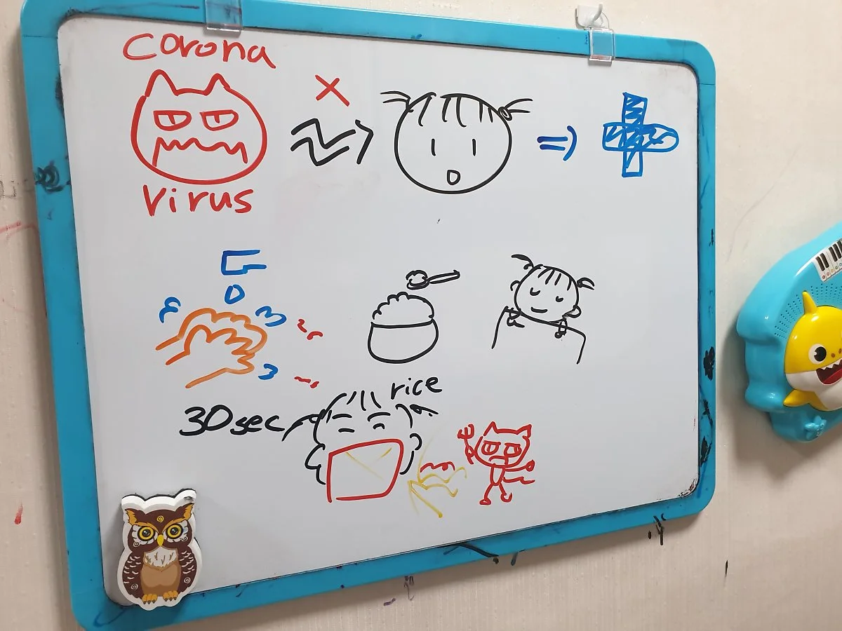 첫째 히로도 어린이집에서 손소독제도 만들어보고 매일 교육을 받고 있는지 코로나 바이러스 이야기를 많이 한다. 그래서 히로와 화이트보드에 어린이집에서 배운 예방 수칙을 함께 이야기해보며 정리해보았다.