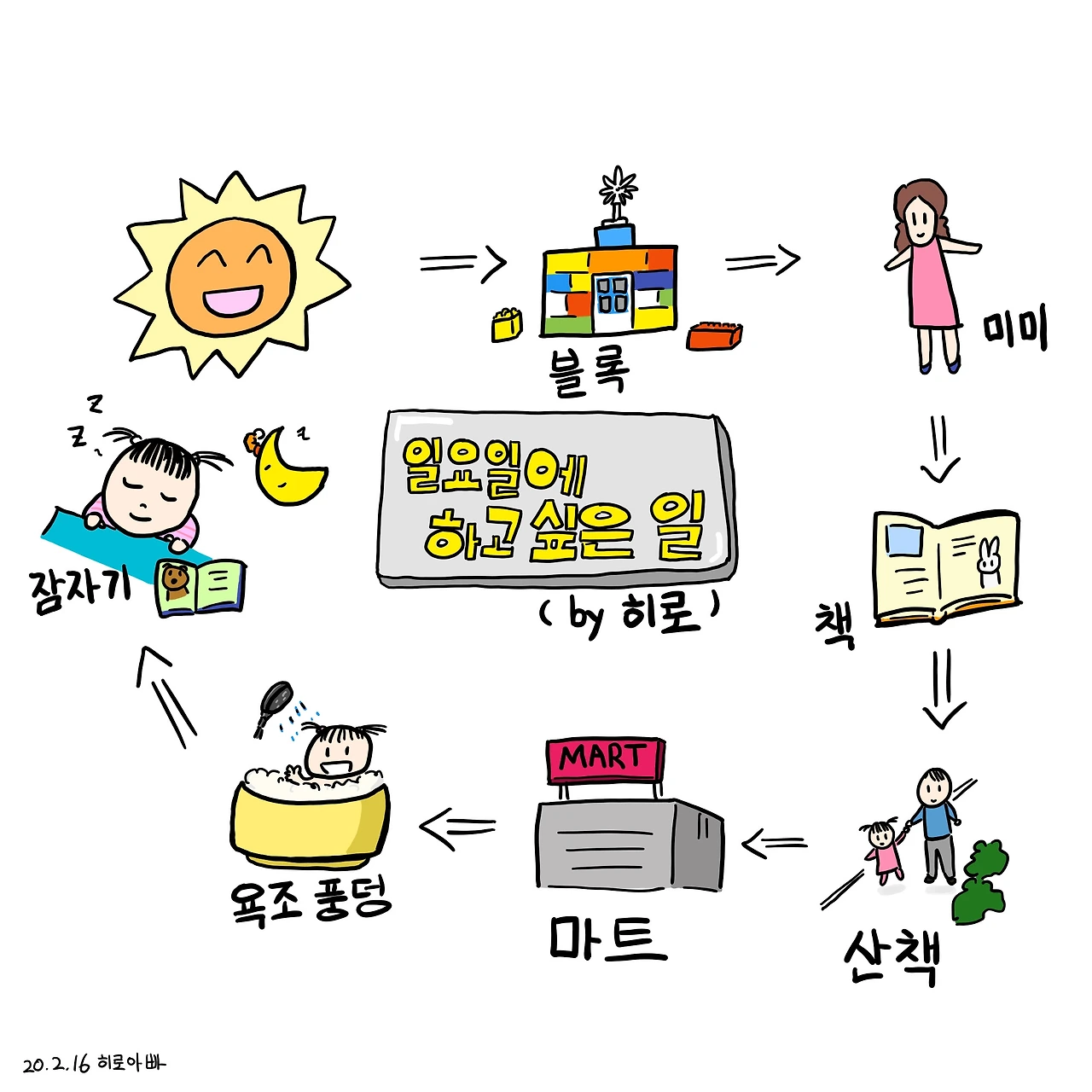 다섯 살 히로는 하루가 끝날 때쯤이면 더 놀지 못해 아쉬워한다. 아쉬움에 아랫입술이 삐쭉 나온 그녀를 위해 어젯밤 잠들기 전 스케치북을 꺼내 일요일에 하고 싶은 일들을 물어보았다. 히로가 이야기해주는 것들을 그림으로 그리며 아빠와 히로의 일요일 계획표를 만들었다. 그리고 오늘 계획표를 보며 하나씩 순서대로 다 해보기로 했다.