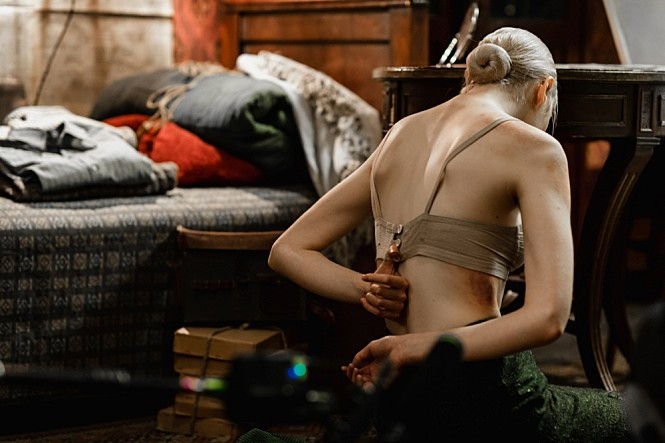 영화 <빈폴> 스틸컷적녹대비 조화가 러시아 명화를 보는 듯 고혹적이다. 모든 것이 망가졌으나 이야와 마샤의 공간은 미학적인 사치가 가능했다. 화려한 의상이 아니더라도 마치 크리스마스를 연상하는 적.녹색의 보색대비 옷차림은 인상적이다. 일부러 신경 쓴듯한 미장센은 붉은색의 죽음, 피와 초록색의 삶과 희망을 계속 노출시킨다. 밝은 구석이라고는 찾아볼 수 있는 공허한 회색시대에서 오로지 여성들에게만 허락된 색깔처럼 영롱하게 빛난다. 후반부로 갈수록 녹색으로 물들어가는 색감은 되찾은 희망이라 봐도 좋다.