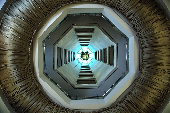 오랜만에 돌아온 호텔은 그때 그대로 시간이 멈춘 듯했다. 고풍스러운 인테리어며 사람을 압도하는 기분까지. 한적한 시골 동네 분위기와는 달리 전체적인 음산함이 느껴진다. 들어오는 순간 숨 막히게 하는 중압감은 나선형 구조와 더불어 파놉티콘을 연상케 한다. 마치 천장 유리에 CCTV가 달린 것처럼 누군가가 지켜보고 있다는 섬찟한 생각을 떨칠 수 없게다. 파놉티콘은 중앙의 거대한 원형 감시탑이 둘레 객실을 감시하고 있어 가진 자의 지배가 가능하다고 할 수 있다. 유미는 일거수 일족을 지켜보는 쪽이 사람인지, 귀신인지 헷갈리기 시작한다. 분명히 호텔에 누군가가 있다고 느끼지만 물증이 없어 의심만 늘어난다.