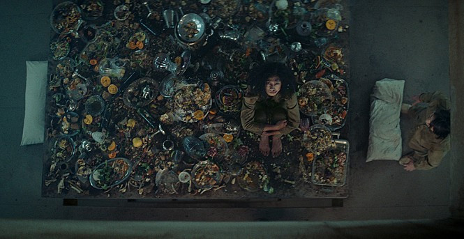 영화는 타인과의 연대, 고착된 시스템을 바꾸는 게 얼마나 힘든지를 충격적인 이미지로 보여준다. 이 건물에는 나름의 규칙이 있다. 닥치는 대로 먹어두지 않으면 언제 또 먹을 수 있을지 모른다는 것이다. 플랫폼 위에 있을 때만 섭취가 가능하며 음식을 쟁여 놓았을 경우 여지없는 제약이 가해진다. 때문에 더더욱 지금 먹지 않으면 안 된다는 강박관념이 커진다.