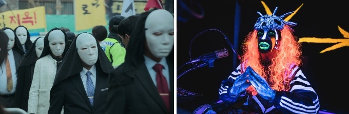 넷플릭스 [지옥] 스틸컷 [지옥]은 말 그대로 우리가 그동안 생각했던 지옥의 개념을 뒤엎습니다. 정형화된 사자와 천사의 모습도 낯설기만 합니다. 항상 셋이 뭉쳐 다니는 사자(使者)는 집단 린치를 가하는 공포의 대상이 되었죠. 검은 갓과 도포를 입은 저승사자의 개념을 <신과함께>에서 깨준 바 있기에 이번 사자의 모습이 어떻게 그려질까 기대되었는데요.