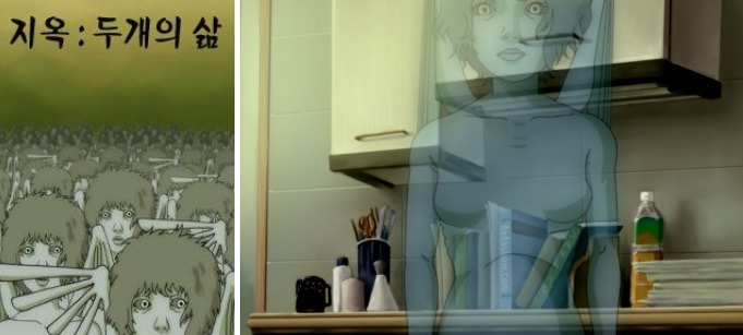 <지옥: 두개의 삶> 스틸컷[지옥]은 2003년 34분 애니메이션<지옥: 두개의 삶>으로 이미 뼈대를 완성했던 연상호 감독의 넷플릭스 드라마로 웹툰을 영상화하는데 성공했다고 할 수 있습니다. 총 6화 시리즈는 2019년부터 2020년 1,2부로 연재를 마친 웹툰을 원작으로 합니다.