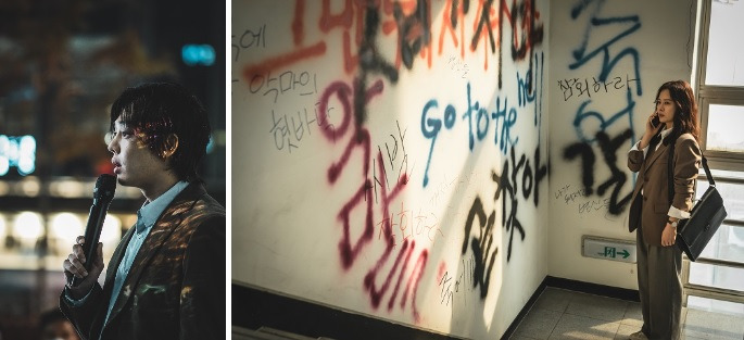 이와 반대되는 캐릭터 변호사 민혜진은 법을 믿는 자로서 혼란스러운 세상에서 티끌처럼 남아 있는 정의를 지키려는 사람입니다. 미쳐 날뛰는 새진리회와 화살촉(김도윤)을 막고자 몸 사리지 않죠. 이를 그냥 두고 볼 수 없는 민혜진은 유가족을 돕기 위해 목숨을 걸고 대립합니다.