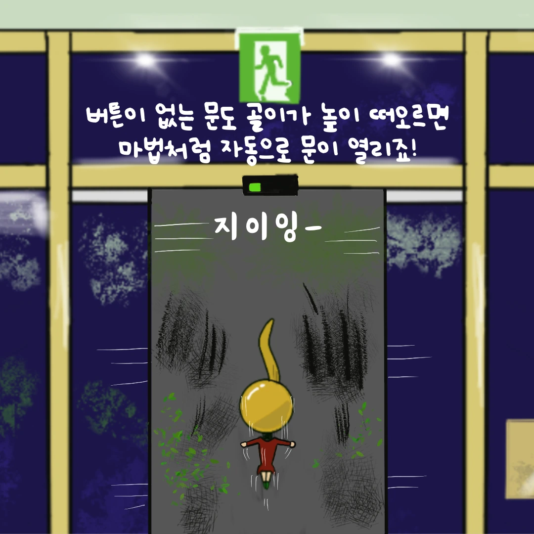 버튼이 없는데도 골이가 높이 떠오르자 1층 자동문이 마법처럼 열렸습니다.