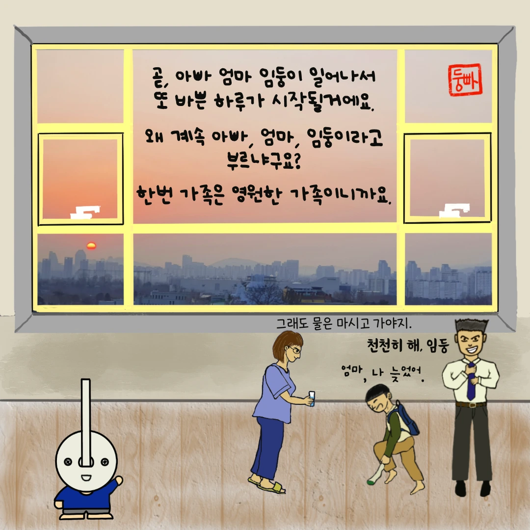 "아빠는 회사에 출근할 거고, 엄마는 임둥이 늦지 않게 학교에 갈 수 있도록 할 거고,