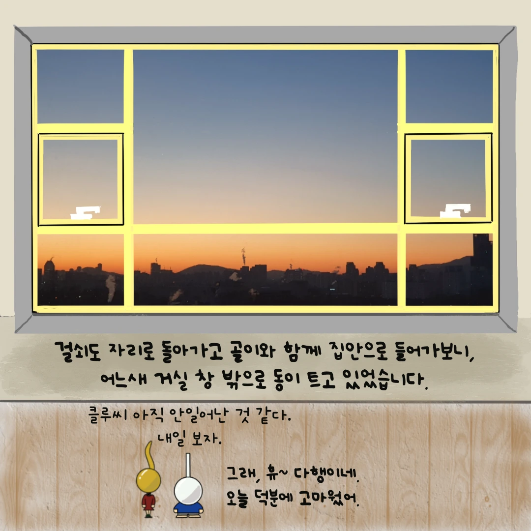어느새 거실 창 밖으로 동이 트고 있었습니다.