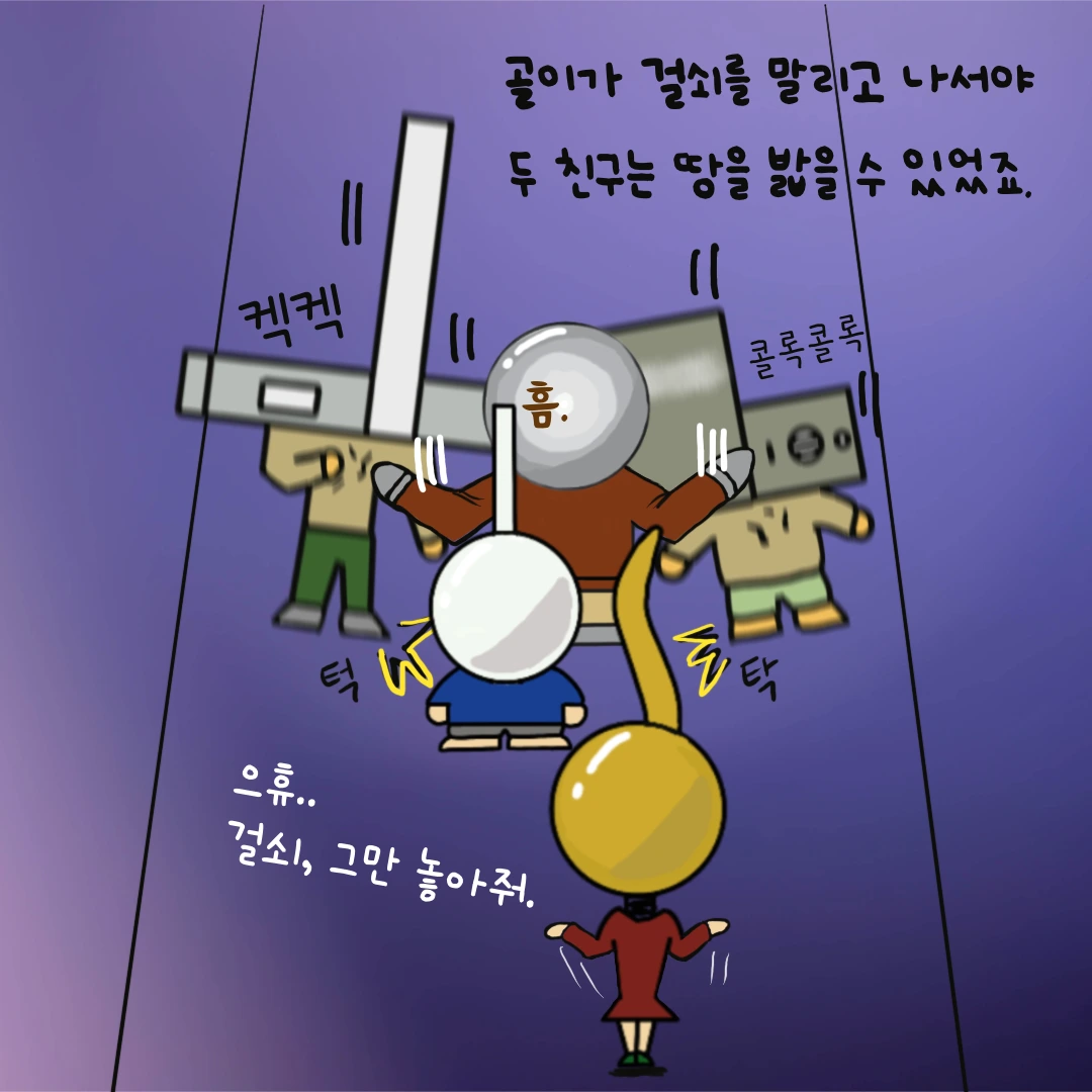 뒤늦게 따라온 골이가 걸쇠를 말리고 나서야 두 친구는 겨우 땅을 밟을 수 있었습니다.