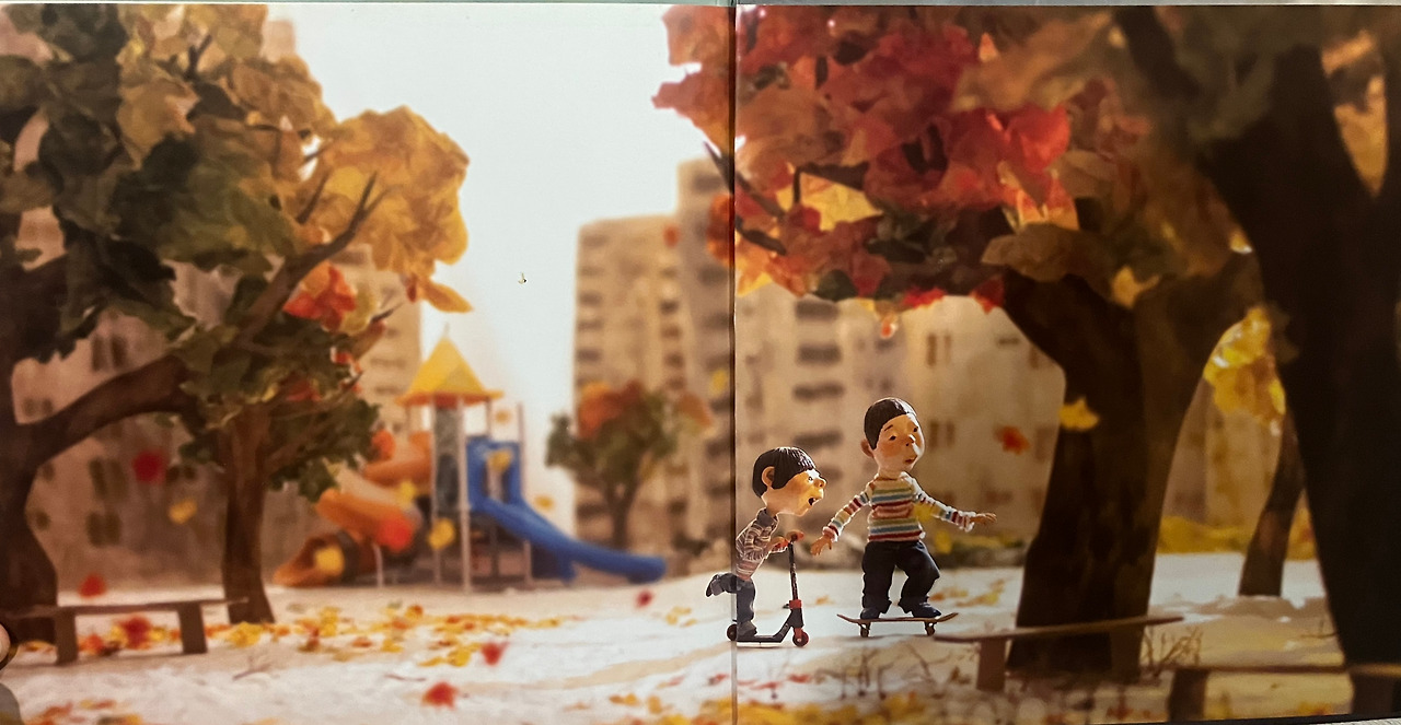 그렇게 그림책 표지를 좌우로 활짝 펼치고 나면 표지에 있던 그림이 뒤표지까지 연결되어 있다는 걸 발견할 때가 있다. 별것 아닌 이 경험만으로도 아이들의 눈은 동그래진다. “책이 커졌어!”