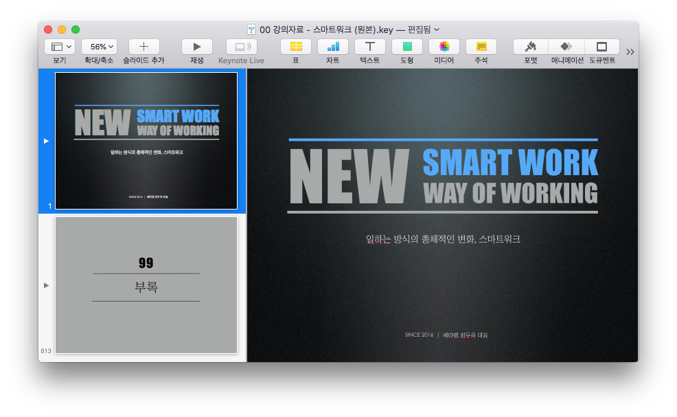 보통은 회사 근처의 카페에 일찍 가서 강연 내용을 리마인드한다. 기본적인 콘텐츠가 있지만, 강연 내용은 항상 다르다. 스마트워크 단계와 강연 대상의 직급에 따라 내용을 커스터마이징을 하기 때문이다. 전체의 30%는 청중을 위한 새로운 리서치고, 20%는 스마트워크에 관한 최근 업데이트다. (대략 두 주를 주기로 업데이트가 된다). 지난 3년간 강연한 내용을 하나의 파일로 정리한 DB가 있는데, 단순 키워드나 이미지를 삭제하고도 800장이 넘는다.