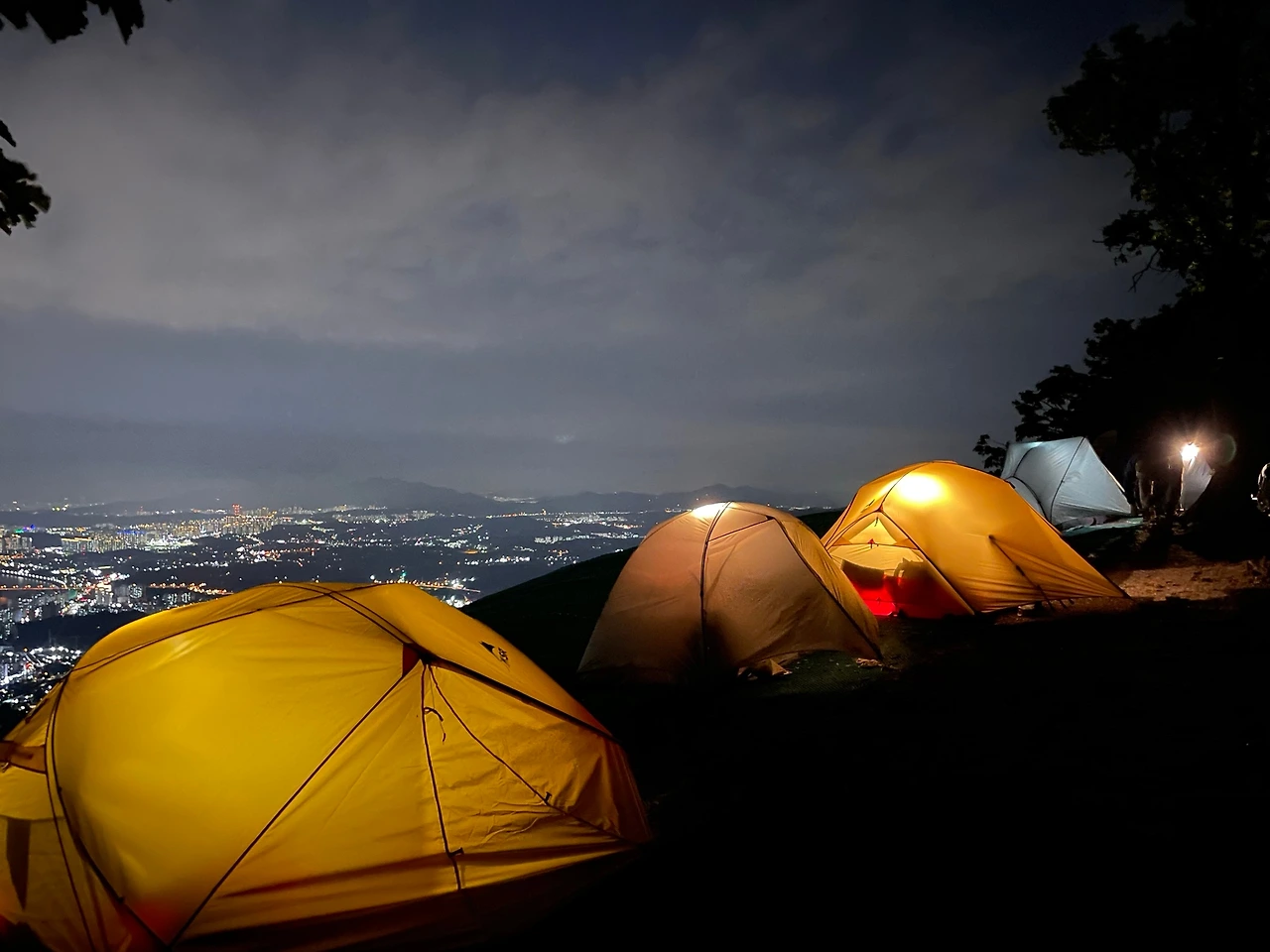텐트 피칭 후 드디어 여유를 즐기는 시간. 마음이 고요하고 편안했다. 잠깐 다른 세계로 온 기분. 오늘 아침 서울에서 짐을 쌀 때와는 다른 사람, 다른 세계같다. 기분좋은 변화다. 시작부터 끝까지 만화처럼 완벽한 순간은 단 한번도 없었다. 오히려 덤벙거리는 순간들이 쭉 이어졌다. 저녁거리도 준비 안해서 환승역이었던 왕십리역 내에 있는 매점에서 꼬마김밥을 사왔고, 우천대비를 안 해 새벽에 내린 비바람에 텐트가 날아갈까 마음 졸이며 잔 우리였다. 말 그대로 우당탕탕하며 첫 백패킹을 마쳤다. 다음 산행 때 보완 필요한 것들은 따로 적어뒀다. 근데! 만약 다음에도 준비를 갖추지 못한 상태에서 떠나야 하는 상황이 온다면 그 대답은 언제나 YES!!