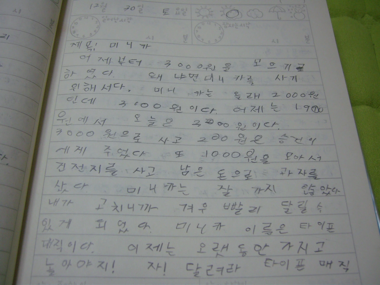 어제부터 3000원을 모으기로 하였다. 왜냐면 미니카를 사기 위해서다. 미니카는 원래 2000원이었는데 (가격이 올라서 이제는) 3000원이다. (모은 돈이) 어제는 1900원에서 오늘은 3000원이다. 3000원으로 (미니카를) 사고 200원은 승건이(동생)에게 주었다. 또 1000원을 모아서 건전지를 사고 남은 돈으로 과자를 샀다. 미니카는 잘 가지 않았다. 내가 고치니까 겨우 빨리 달릴 수 있게 되었다. 미니카 이름은 타이푼매직이다. 이제는 오랫동안 가지고 놀아야지! 자! 달려라 타이푼매직!