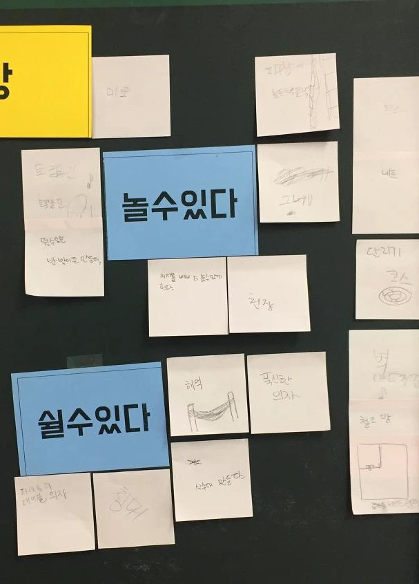 지난주, 우리가 만든 열 가지 요소(쉴 수 있다, 놀 수 있다, 이야기하다, 숨을 수 있다...)를 가지고 바꿔볼 만한 학교 공간을 조별로 하나씩 선정했습니다. 크게 세 장소가 나왔습니다.