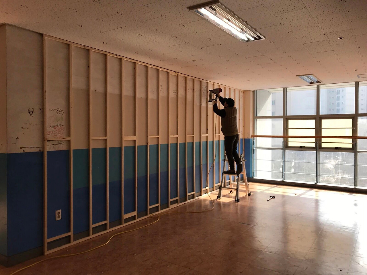 중간마당이 내려다보이는 창문 앞 벤치 디자인도 조금 변경되었습니다. 적정한 복도 폭을 확보하기 위해 블록 사이즈가 450mm에서 400mm로 바뀌었습니다. 어른이 앉기에는 조금 불편해졌지만 어린이들이 쉬기에는 적당한 사이즈지요. 벤치 옆과 뒤를 차지하고 있던 수많은 서랍장들은 전부 생략되었습니다. 숨기는 재미가 많은 것도 좋지만 관리가 안되면 냄새도 날 테고 가기 싫은 곳으로 변하게 될 가능성이 많으니까요. 대신 낙서판 쉼터에 일부 서랍을 남겨두는 정도로 이슈를 정리했습니다.