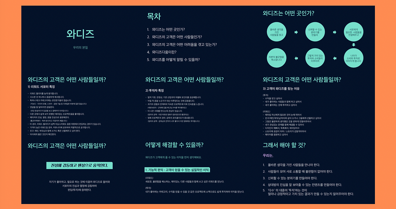 이렇게 일주일간 댓글들을 읽고 분석한 끝에 <와디즈, 우리의 본질>이라는 문서를 만들었다. 대표님께 보고하고 팀에도 공유했다. 무엇보다 이 과정을 지나며 내가 이 팀에서 무슨 일을 해야 할지 명확하게 그릴 수 있었다. 이때 만든 자료는 아직도 간혹 열어본다. 놀랍게도 지금의 방향성과 크게 다르지 않다.
