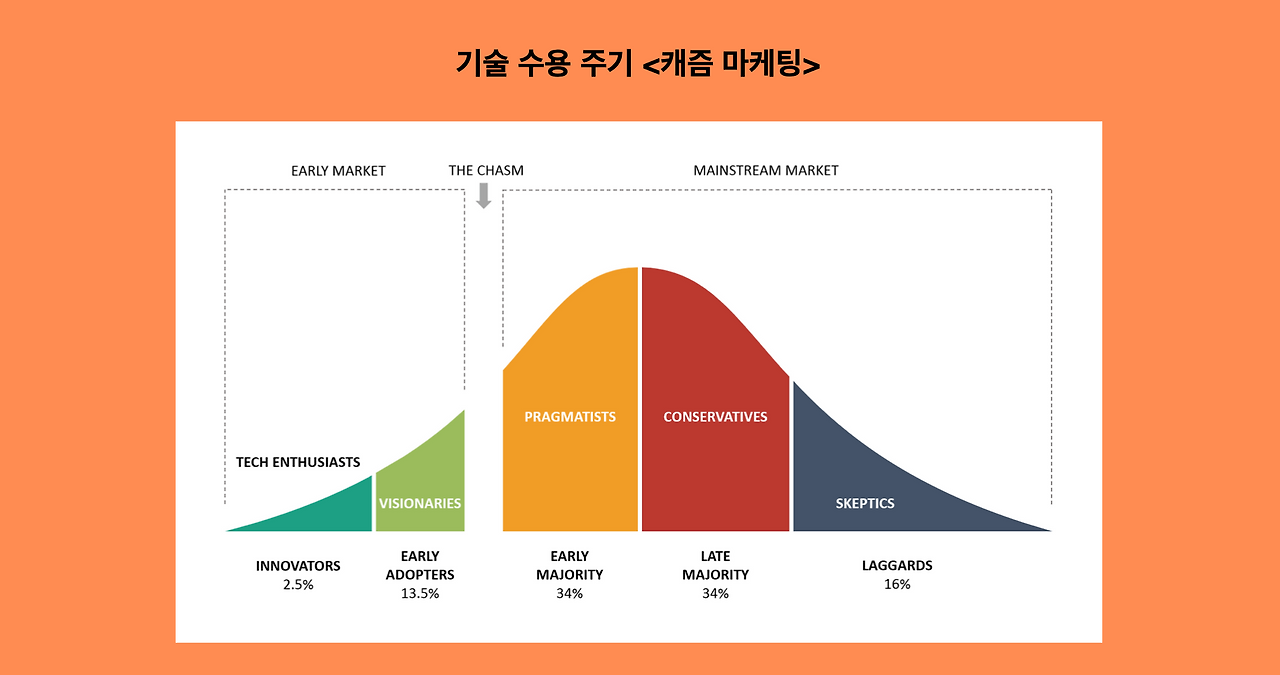 <캐즘 마케팅>이라는 책을 보면 하나의 기술이 대중에게 받아들여지기까지의 과정을 나타낸 기술 수용 주기 단계가 등장한다. 하나의 새로운 기술, 시장은 Innovator(혁신 수용자)를 시작으로 Early Adopter를 거쳐 본격적인 대중 시장에 진입하게 되고 Early Majority와 Late Majority를 거쳐 서서히 Laggard(회의주의자, 말기 수용자)를 맞이한다.