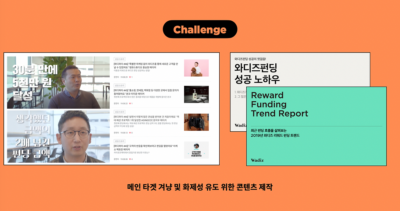 우리 플랫폼에 올라와있는 프로젝트만으로는 소재가 부족해서 당시의 뉴스나 트렌드와 펀딩을 엮기도 했고, 킥스타트/인디고고 같은 해외 펀딩 플랫폼에서 화제가 되고 있는 프로젝트를 공유하거나 우리 프로젝트와 비슷한 프로젝트를 엮어 콘텐츠를 만들기도 했다.