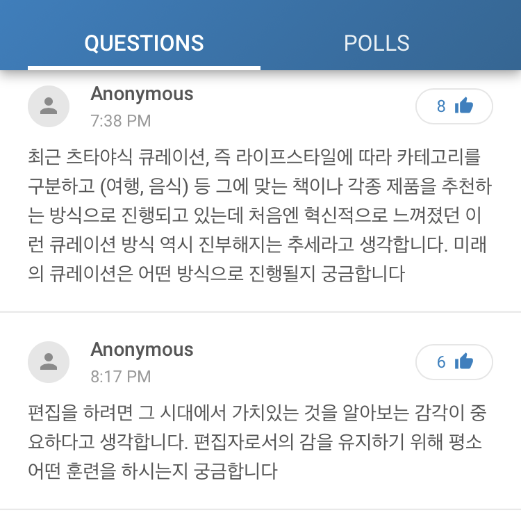 나는 최근 츠타야식 큐레이션으로 대변되는, 라이프스타일과 관련된 특정 카테고리를 정하고 그에 맞는 다양한 제품을 함께 추천하는 큐레이션이 처음 등장할 때는 혁신적으로 느껴졌지만 점차 진부해지고 있다고 생각했고, 그렇다면 다음의 큐레이션은 어떤 흐름으로 변화할지에 대한 마사노부의 고견이 듣고 싶었다. (최다 좋아요 를 받은 걸로 보아 나뿐 아니라 많은 사람들 역시 궁금했던 듯)