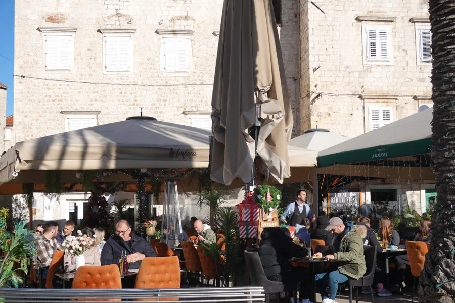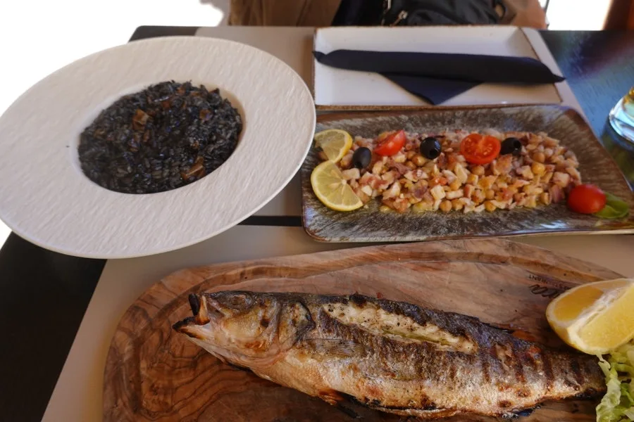 따스한 햇빛 아래 자리 잡은 식당에서 크로아티아 대표 해산물 요리인 농어 구이, 문어 샐러드, 그리고 오징어 먹물이 들어간 블랙 리조또를 주문했다.