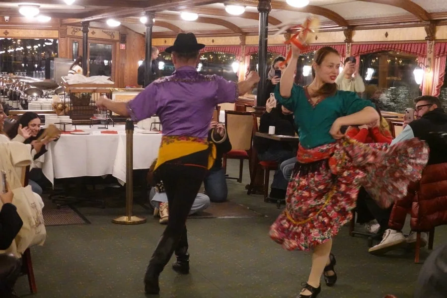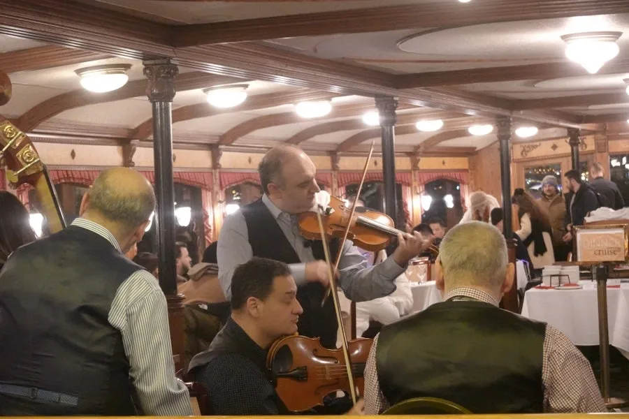 유람선에 승선하여 자리에 앉아 잠시 기다리자 와인 한잔을 가져다주었으며 곧이어 “헝가리 무곡”의 바이올린 연주와 헝가리 전통 댄스 공연도 시작하였다.