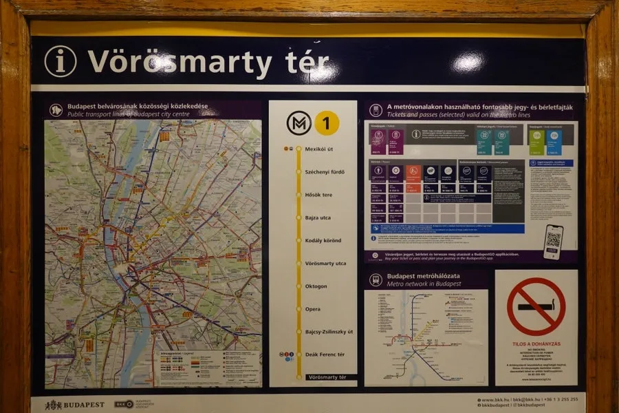 부다페스트 지하철 1호선은 Vörösmarty tér(뵤뢰시마르티 광장)역에서 Opera(오페라 하우스)역 등을 지나 Heroes' Square(영웅 광장)까지로 약 11분 정도가 소요되며 유네스코 세계문화유산인 안드라시 거리(Andrássy út) 아래로 지나간다.