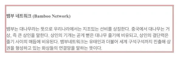 또 하나는 Bamboo Network이라 부르는 화교들의 비즈니스 네트워크이다.