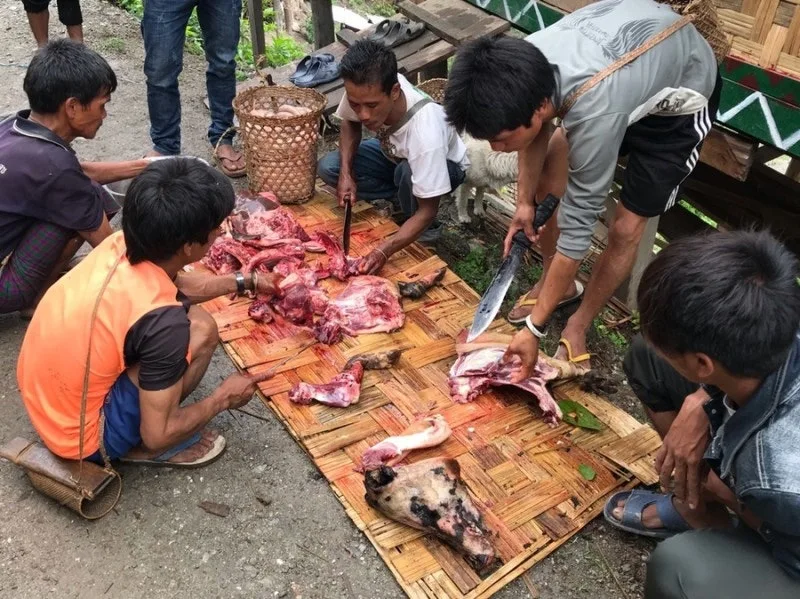 두 번째 도착한 마을은 좁은 마을 도로에서 마을 주민들이 돼지를 잡고 있다.